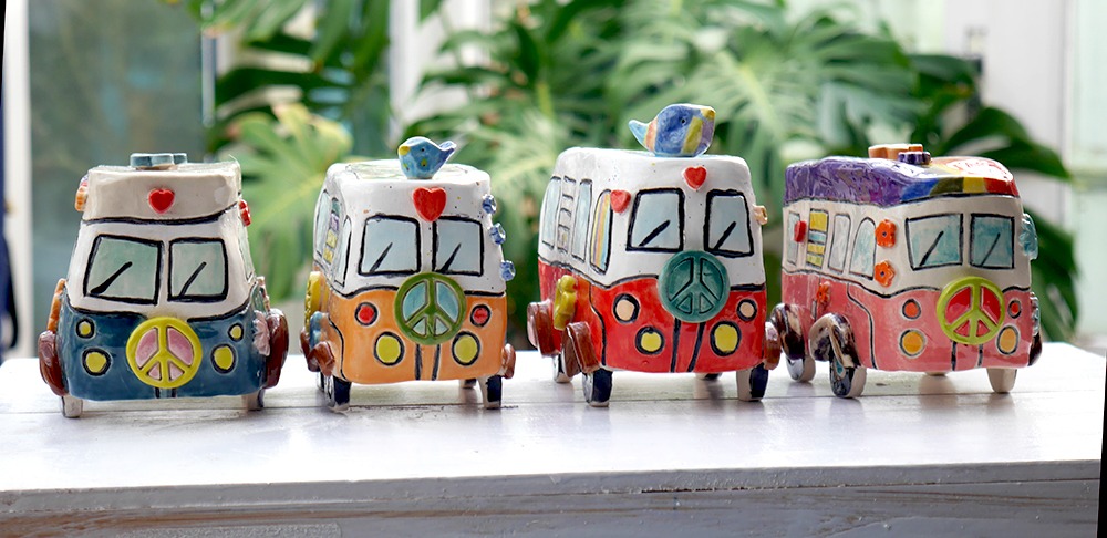 Some of the items below are ready for sale, others are made to order. Collection is preferable but postage may be possible for some of the smaller items like the campervans. Please contact me to discuss. Many of my makes are sold at a monthly market (details on my homepage) or are commissions but I'll be adding to the page regularly - so do come back and take a look. If you see something you like in the Gallery and would like me to create a similar item, then please get in contact. I'm happy to add inscriptions to a pot for a birthday or anniversary, say, and obviously all my pots are different, so your decor preferences are welcome.PLEASE GIVE ME AT LEAST 4 WEEKS NOTICE, thank you.